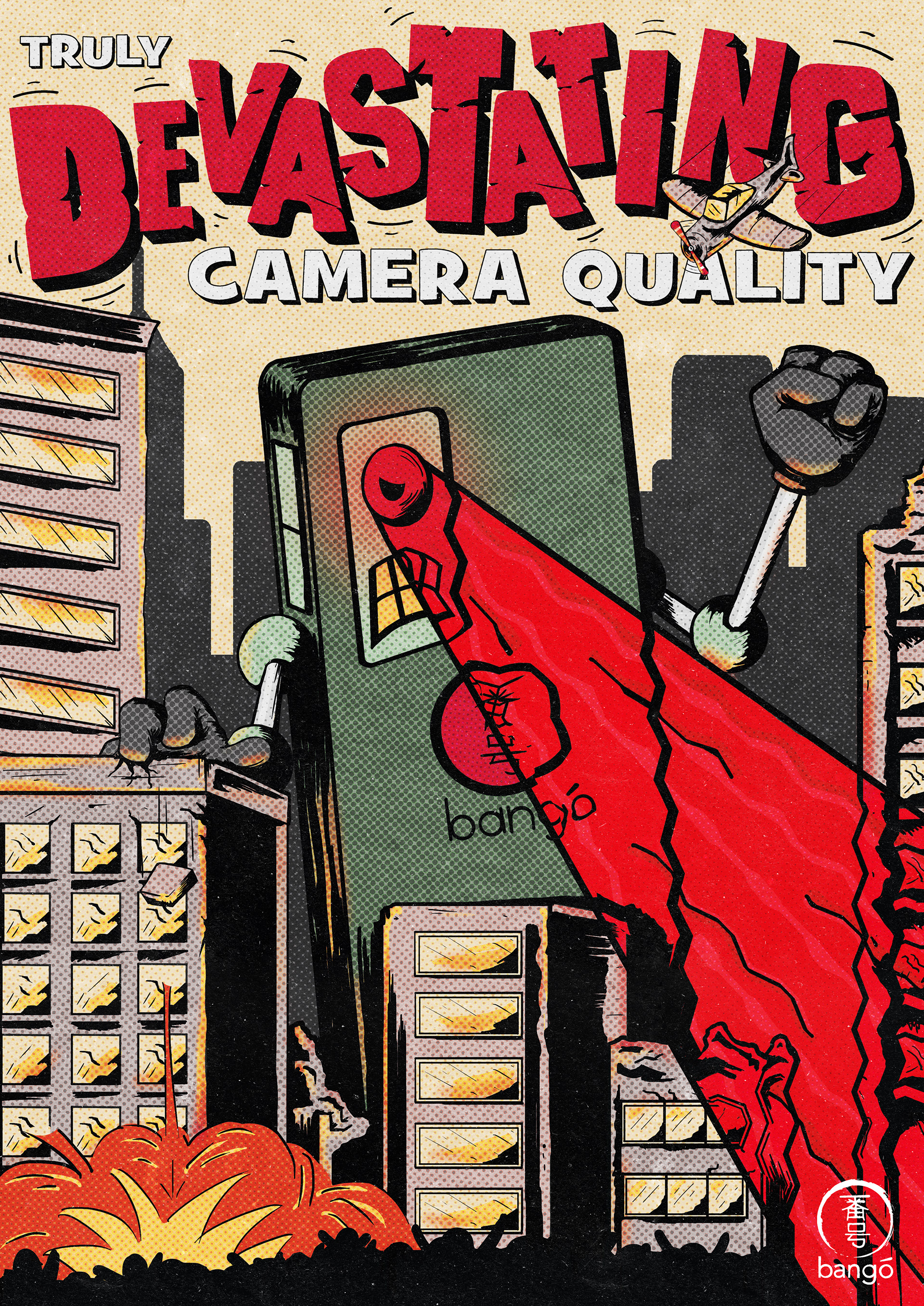 Bango is a new Japanese mobile brand entering a competitive market with a phone boasting an excellent camera, aimed at 18–30-year-olds. The brief was to create a logo, three wallpapers and a poster. Drawing on the company’s Japanese roots, I combined traditional shodō elements for the core identity with a playful Godzilla-inspired poster, resulting in a bold, engaging design that speaks directly to the target audience.